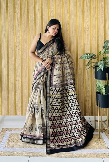 These sarees blend designer aesthetics with heritage: think slim borders with metallic accents or ombre effects in hand-block prints, perfect for pairing with cropped blouses or belts.
