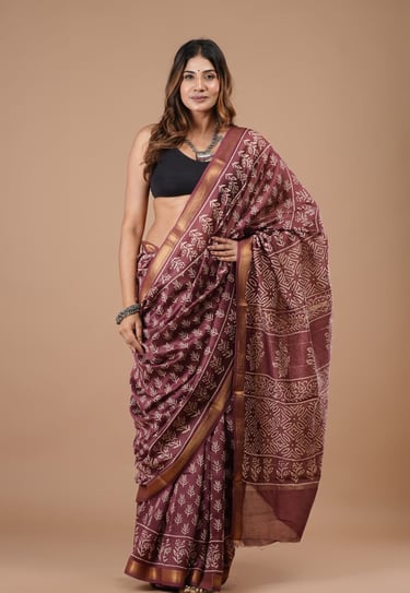 Our hand block printed Maheshwari silk sarees are ideal for such occasions because they provide a refined, rich look without being overly heavy. The silk base ensures elegance, while handcrafted prints and zari borders add ceremonial value. These sarees are especially popular among bridesmaids, close relatives, and guests who want a traditional appearance with ease of movement.