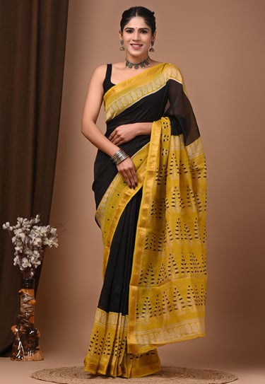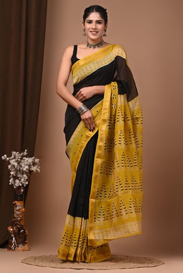 Hand block printed Maheshwari silk sarees resonate with this mindset because they are refined, comfortable, and thoughtfully crafted. The softness of silk, the rhythm of block prints, and the gentle shimmer of zari together create a saree that feels dignified and timeless.
