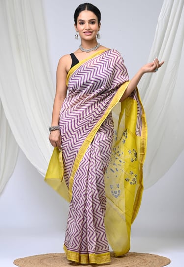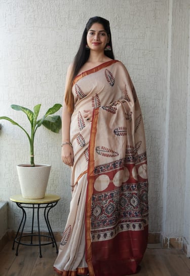 What makes us stand out is the craftsmanship: each saree is hand-block printed by artisans in Maheshwar using wooden blocks and natural dyes, resulting in unique patterns that can't be perfectly replicated by machines.